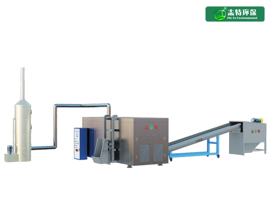 高温生物降解设备,主要包含:物料提升机、病死动物破碎机、物料输送螺旋、高温生物好氧发酵机、物料输送皮带、滚筒筛、臭气处理系统、控制系统等组成。病死动物放入自动提升机料仓中,经自动提升倾倒进入病死动物破碎机,破碎后经底部螺旋输送机进入生物好氧发酵机,经好氧发酵完成后自动出料至皮带输送机,送入小型滚筒筛,筛分出未动物毛发、大型骨料等,其余作为高效肥基肥。处理过程中产生的臭气经风机吸入臭气管道并最终进入喷淋塔,去气味排放。